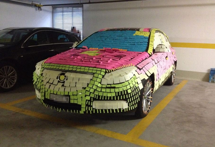 Dois ou três desceram ao subsolo e passaram uma hora a colar centenas de autoadesivos tipo post-it no carro do chefe. Até que não ficou feio. Enfim… há gosto pra tudo.