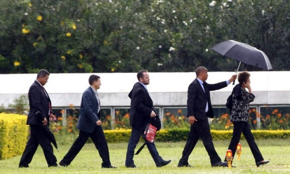 O fotógrafo Ueslei Marcelino captou a doutora Dilma num momento Debret ao caminhar nos jardins do Palácio da Alvorada rumo a um helicóptero. Ela ia à frente de um grupo de quatro cidadãos, todos de roupa escura e em fila indiana. O primeiro a protegia com um guarda-chuva aberto. Já o quarto carregava um guarda-chuva fechado. O segundo levava pequena sacola de papel.