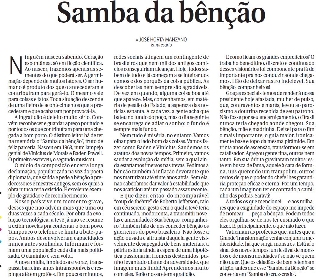 A ingratidão é defeito muito sério. Convém reconhecer e guardar apreço por tudo e por todos os que contribuíram para uma chegada a bom porto. O distinto leitor há de ter na memória o Samba da bênção, fruto de feliz parceria. Nasceu em 1963, num lampejo genial de Vinícius de Morais e Baden Powell. O primeiro escreveu, o segundo musicou.