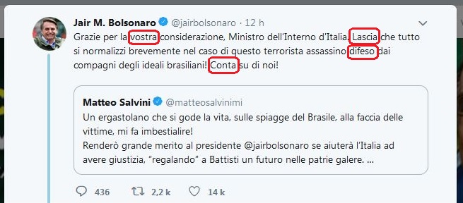 Doutor Bolsonaro ‒ ou os assessores que lhe dão respaldo ‒ estropiaram o belo idioma de Dante. Há erros de grafia (diffeso se escreve com dois ff). Há incongruência nos pronomes de tratamento (quem começa a tratar o correspondente por voi, ao dizer vostra considerazione, tem de continuar com esse tratamento formal, coisa que nosso nacional Jair não fez, ao passar a utilizar o tu, marca de inadequada familiaridade). Com o perdão de tupis, goitacazes e tumucumaques, ficou parecendo escrita de índio. Deu a imagem de que, além de submisso, o novo presidente é inculto. Lamentável.