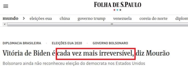 O general quis dizer que a vitória de Biden está cada vez mais difícil de reverter ou cada vez mais próxima da irreversibilidade. Assim que se tornar irreversível, pronto, acabou, não volta mais.