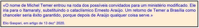 Mas por que é que ele não dá demissão? É permitido imaginar que o que está em jogo não é apenas o salário de ministro – afinal, o soldo de general é suficiente pra levar uma vida confortável. Fica no ar a impressão de que debaixo desse angu tem carne. Pra se rebaixar a esse ponto perante seus 200 milhões de conterrâneos, a razão há de ser maior que um mero contracheque mensal. Que será? A cada um, a liberdade de cogitar.