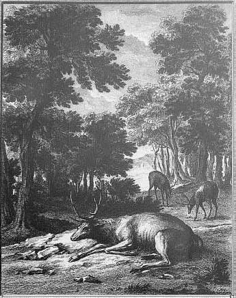 O cervo está gravemente doente e geme estirado no chão. Os animais, que são seus amigos, vão chegando.