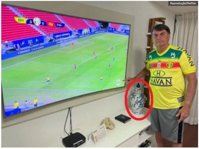 O embaixador da China no Brasil demonstrou não ser rancoroso. Apesar de todos os insultos que a nebulosa bolsonárica tem feito a seu país, presenteou o presidente com um vaso chinês em março do ano passado. Deve ser o objeto que aparece entre o presidente e a tela, na foto abaixo,