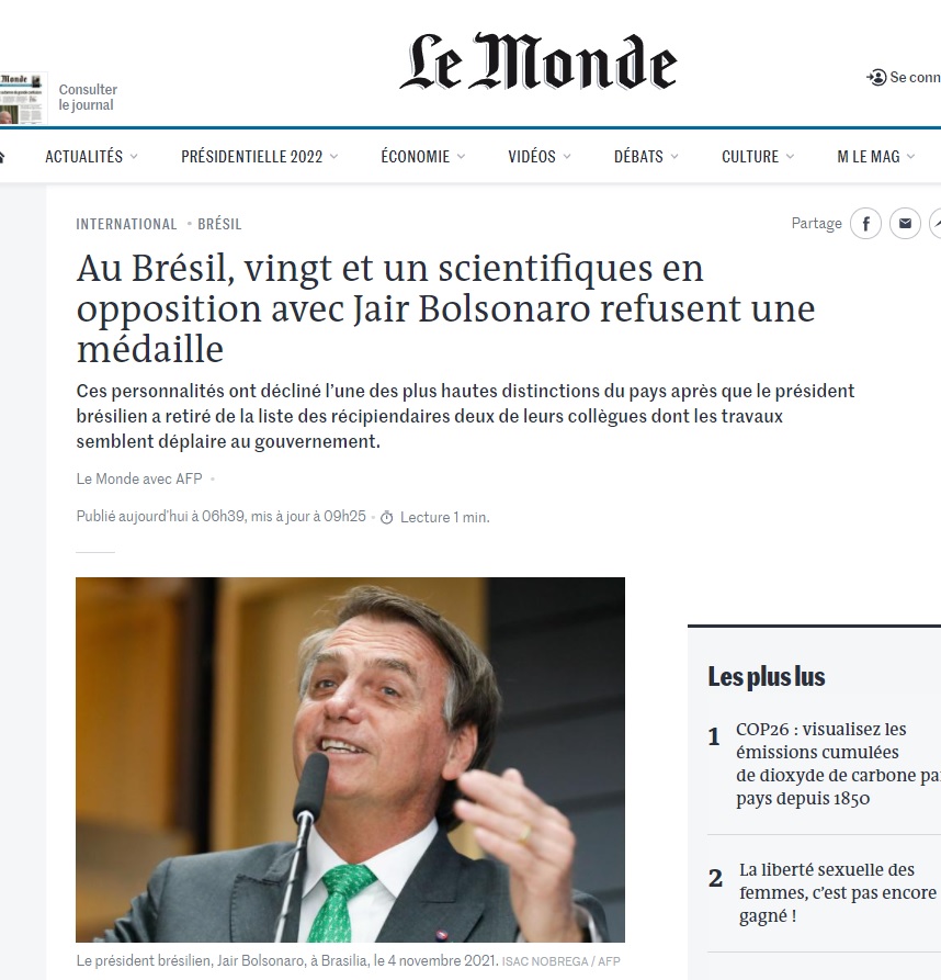 No Brasil, 21 cientistas que discordam de Bolsonaro recusam uma medalha