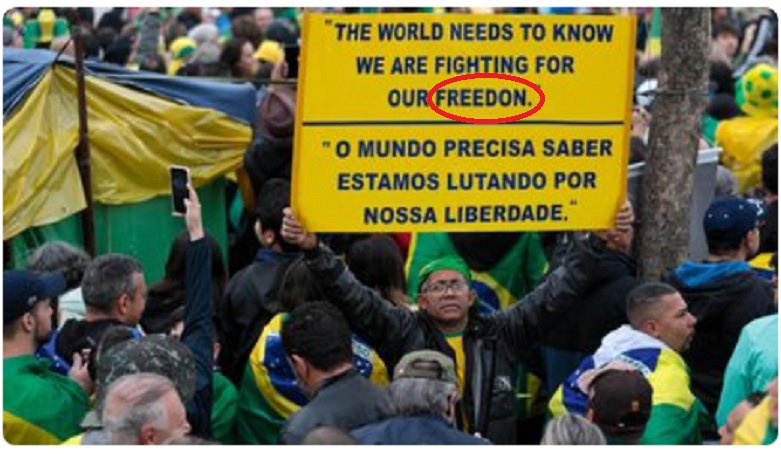 Francamente, ignorância e desleixo parecem estar incrustadas no universo bolsonarista. A foto acima foi tirada num desses acampamentos organizados diante de quartéis. De novo, maltrataram uma palavra da língua inglesa. “Freedom” (=liberdade) aparece mal grafada.