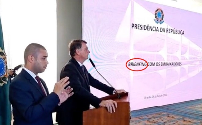 Na ocasião da palestra oferecida por Bolsonaro aos embaixadores, o telão erguido ao lado do orador dizia que a palestra era um “brienfing”. A palavra utilizada me pareceu ofensiva e presunçosa. No original, designa uma reunião em que o discursante dá instruções aos que assistem. Para coroar, foi mal grafada. Por ignorância ou desleixo, enfiaram um “n” onde não devia estar. O correto é “briefing”.