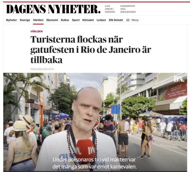 O jornal sueco Dagens Nyheter é o maior e mais importante diário não só da Suécia mas de toda a Escandinávia. Estes dias, seu correspondente permanente no Brasil, baseado no Rio de Janeiro, escreveu um artigo (acompanhado de um vídeo) sobre o carnaval.