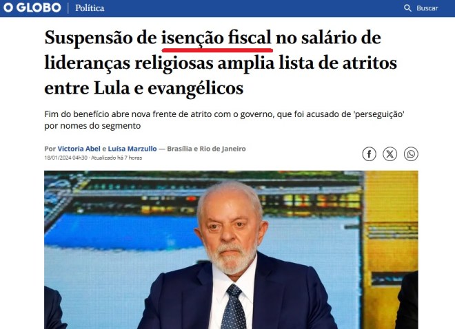 Não sei se o Lula, que mexe em vespeiro ao pôr ordem na fiscalidade do país, vai aguentar o tranco. Tem gente muito influente por detrás dessa aberrante isenção concedida às “lideranças religiosas”.