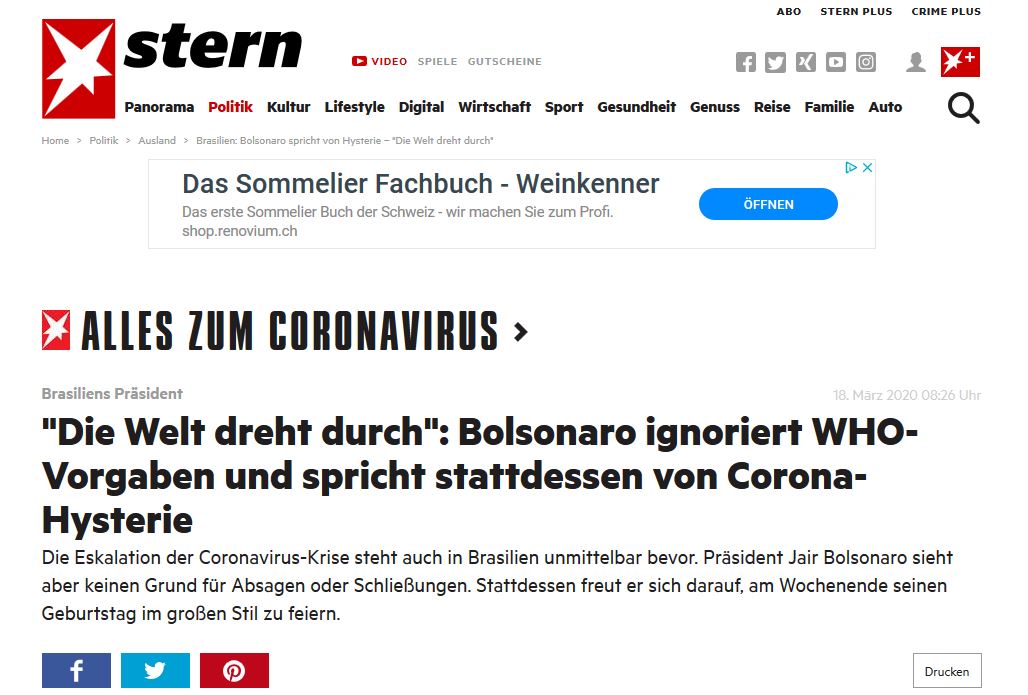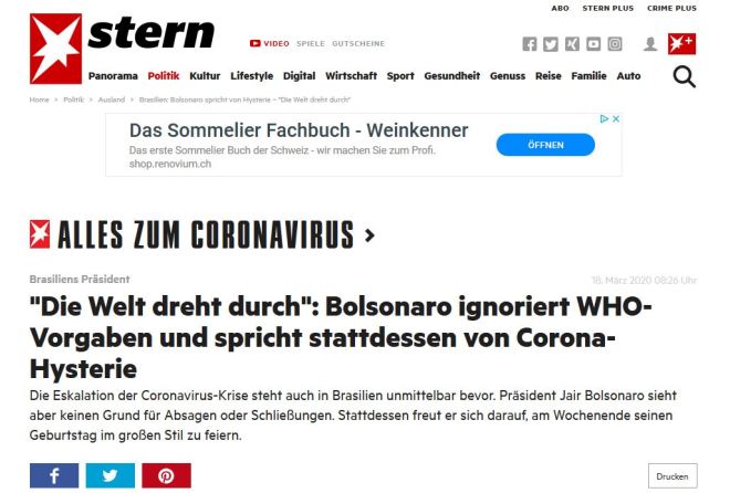 A segunda observação é temporal: a decisão chega tarde demais. Duas semanas atrás, quando a epidemia já castigava Ásia e Europa mas não tinha aportado nestas terras descobertas por Cabral, ainda dava tempo. O problema é que, naquela altura, a alta cúpula federal enxergava a doença como «histeria» e «fantasia da grande mídia». Estamos agora pagando o preço da leviandade e da ignorância dos que nos dirigem – principalmente do chefe deles todos.