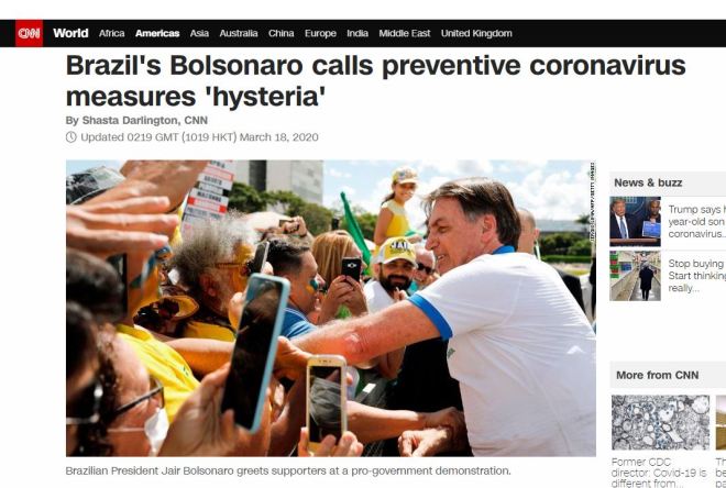“O mundo está enlouquecendo”: Bolsonaro ignora as diretrizes da OMS e fala em histeria corona.