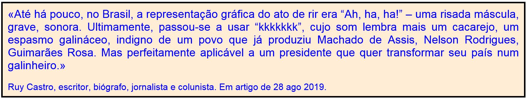 Recuemos a 1943, quando respirávamos a athmosphera, caprichávamos na caligraphia, usávamos o telegrapho, desenhávamos polygonos, nos falávamos ao telephone (que então só falava, não tirava photoghraphia), e comíamos vegetaes. Nosso idioma era o portuguez e assim é que devíamos escrevel-o, fosse no Alentejo, fosse no Piauhy.