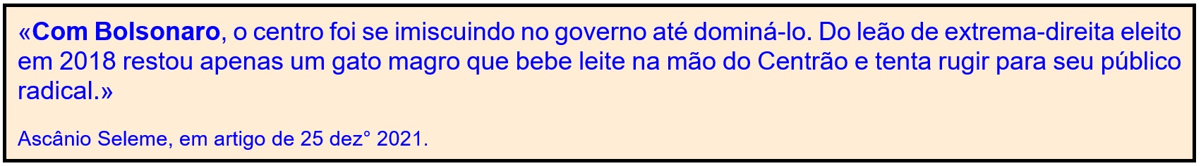 Mas não adianta. Não há pior cego que aquele que não quer ver. Vamos torcer para que as eleições deste novo ano não nos ponham de novo um estropício na Presidência – nem este, nem aquele. Feliz 2022 a todos!