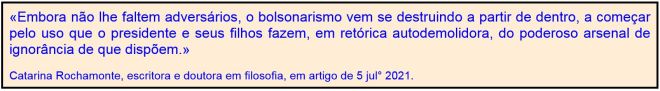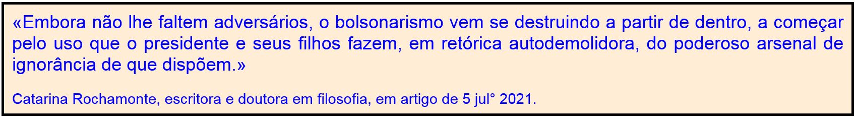 Reproduzo abaixo a introdução: “Não vou dizer ‘bem feito’, ‘bem que eu avisei’, nem ‘só você não percebeu que ia dar com os burros n’água’ para nenhum amigo meu, real ou virtual, que tenha achado que valia a pena eleger a geringonça que nos desgoverna hoje… Minha recusa em aderir ao bolsonarismo também tinha pouco de racional. Era e continua sendo uma questão instintiva, um alerta recebido pelos meus sensores de que a tragédia da volta dos anos de chumbo nos esperava logo adiante” [maio de 2019].