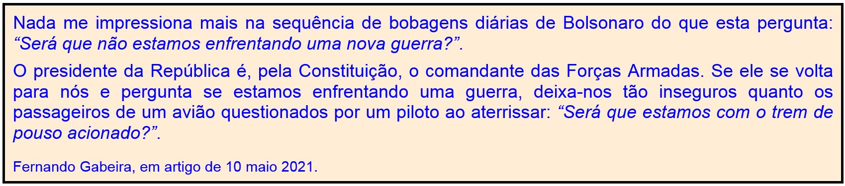 O Brasil de Bolsonaro desviou da rota do bom senso e seguiu em direção oposta. O presidente fez (e continua fazendo) campanha contra a vacinação. Sem se dar conta do mal que já causou e que continua a causar, não perde ocasião pra mostrar animosidade contra tudo o que possa limitar o alastramento da epidemia: máscaras, confinamento, distanciação social e, naturalmente, vacinas. Esta não presta porque é chinesa; aquela não compro porque não me ofereceram; aqueloutra nem pensar porque te transforma em jacaré. No fundo, a gente fica desconfiado que, na verdade, ele deve ter medo de injeção.