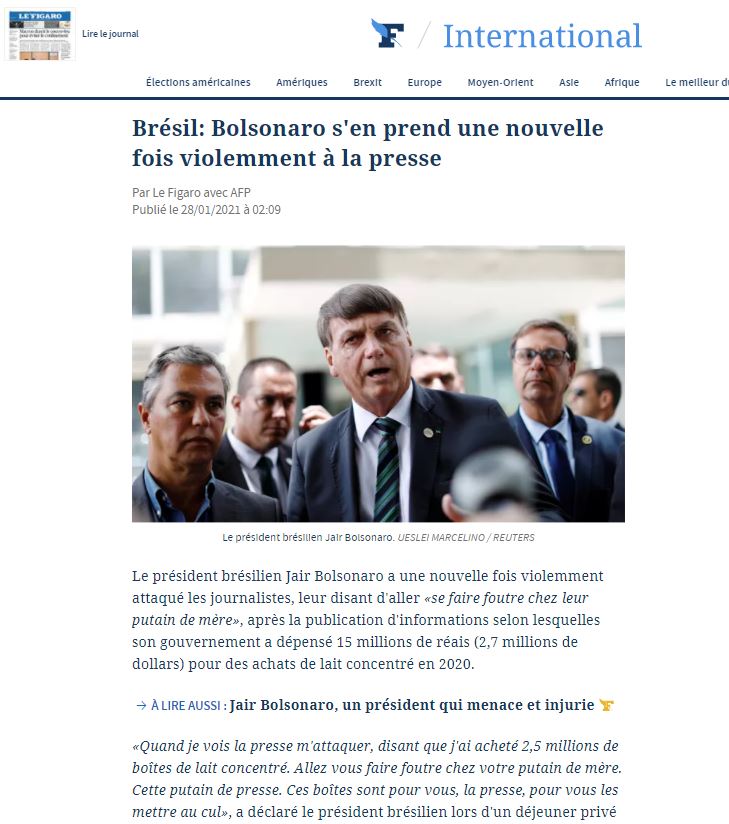 Vindo de doutor Bolsonaro, já nenhuma vilania nos surpreende. Mas fico imaginando os olhos arregalados dos franceses, que estão habituados a outro nível de comunicação pública, ao lerem a frase. Se ela tivesse sido pronunciada por um cafajeste qualquer, seria impressa com tarja preta, censurada para não ferir espíritos sensíveis. Dado que veio do presidente do Brasil, por dever de ofício, o jornal se viu na obrigação de publicar na íntegra.