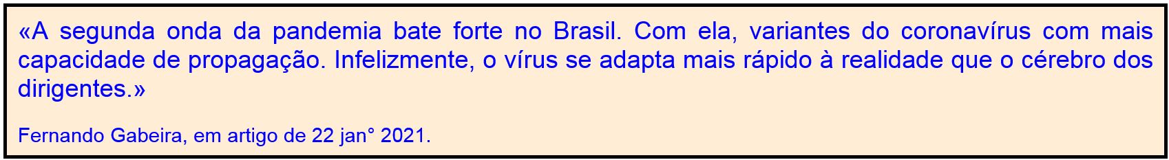Apesar dessa justificativa, há que reconhecer que o Brasil não é o único país grande e populoso. Muitos outros estão na mesma situação e obtiveram resultados melhores. A pesquisa estudou o desempenho de 98 países no enfrentamento da covid. Sem surpresa, o Brasil classificou-se em… 98° lugar. O último da classe. Na rabeira, minha gente! Não estamos mais ‘entre os piores’. Somos os piores. Os campeões da indigência.