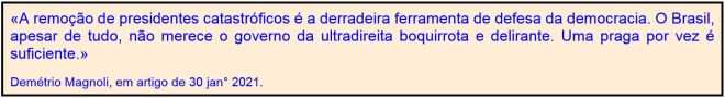 O processo de destituição de um presidente da República é longo e doído. E deixa sequelas. Quando possível, é melhor evitar. Mas no caso de doutor Bolsonaro, não dá pra esperar. Tem de ser já, agora, antes que a destruição das instituições chegue a um ponto irrecuperável.