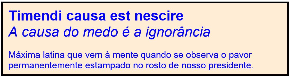 Não tem importância. Só a lembrança de que já tivemos um presidente que fazia citações em latim já é um bálsamo. Acende a esperança de que doutor Bolsonaro não será uma verruga encravada na alma nacional por muito tempo. Um dia, que esperamos seja o mais logo possível, seremos brindados com inquilino do Planalto menos agreste.
