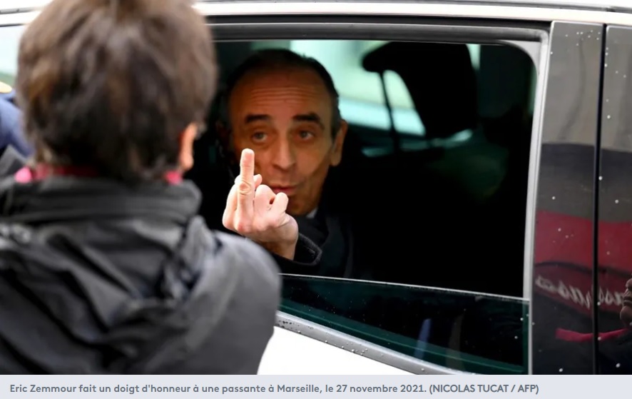O extremista ainda não oficializou sua candidatura. Por enquanto, percorre o país fazendo publicidade para seu novo livro e testando a receptividade da população a sua presença. Sábado esteve em Marselha. Como de costume, foi acolhido tanto por admiradores como por oponentes. A um dado momento, não se conteve e mostrou o dedo a uma mulher (veja a imagem).