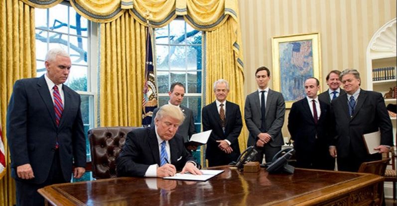 Circundado por sete homens engravatados, Donald Trump assina decreto limitando o financiamento de ongs que defendem o aborto. A imagem é simbólica: um conclave exclusivamente masculino retratado no exato momento em que, de certa maneira, cerceava a liberdade feminina de dispor do próprio corpo. A foto deu a volta ao mundo.