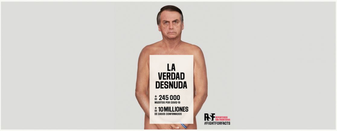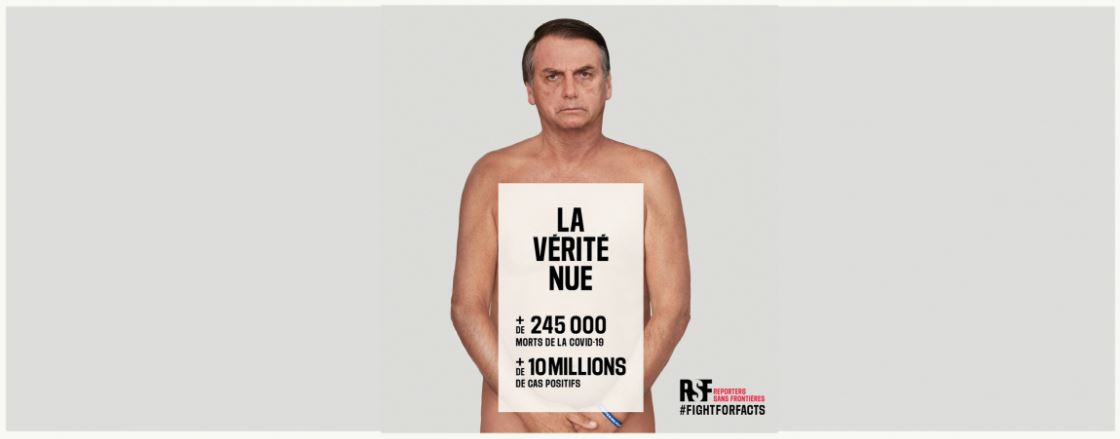 Para denunciar os maus-tratos que o presidente tem infligido aos brasileiros, a RSF lançou nova campanha de informação. A intenção é chamar a atenção para as mentiras espalhadas pelo Sistema Bolsonaro. A imagem-símbolo é uma montagem em que o doutor aparece atrás de um cartaz com os dizeres «A verdade nua», além do número de mortos e de casos positivos da covid.
