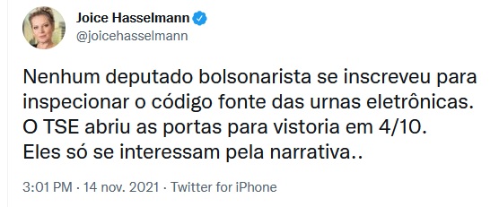 Que o Tribunal Superior Eleitoral institua um desafio, como foi feito na Suíça. Vamos ver se especialistas em espionagem eletrônica não encontram alguma falha no sistema. Estão com medo de quê?