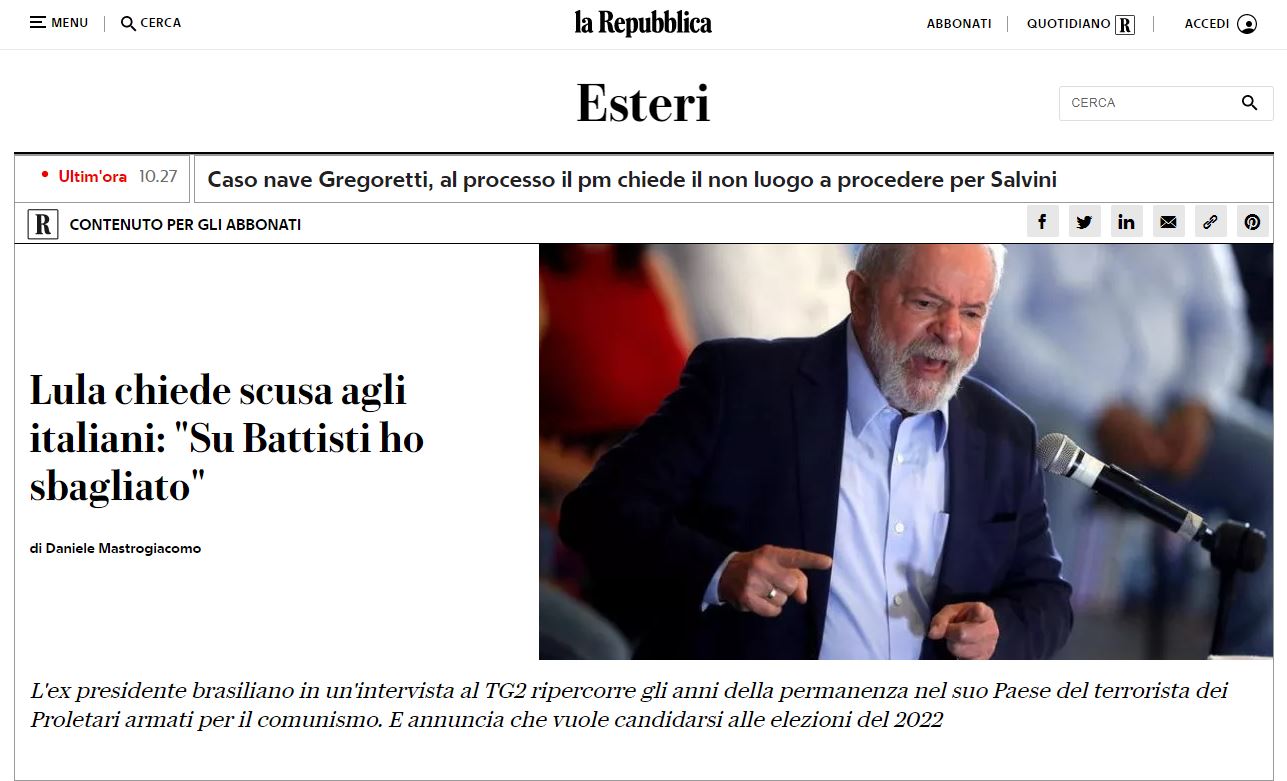 Lula pede desculpas aos italianos: “Sobre Battista, errei”  –   La Repubblica, Turim