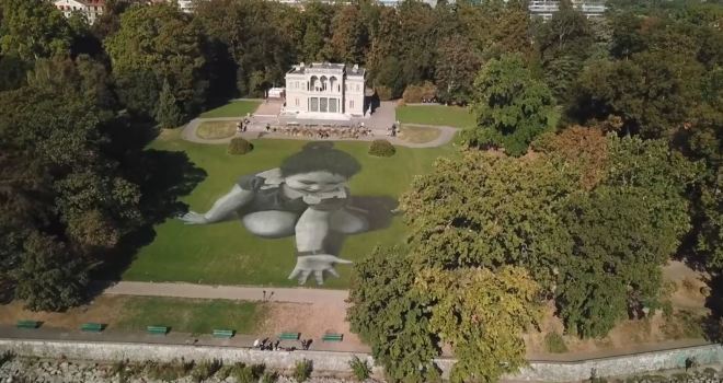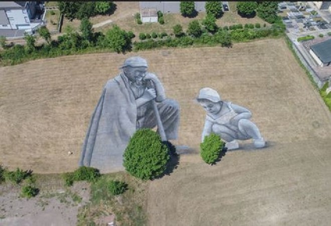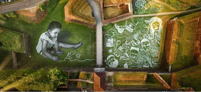 Seguem algumas amostras do trabalho de Saype. Um dos trabalhos mais recentes (quarta imagem aqui abaixo) é uma pintura de 5000m2 feita num parque de Genebra. Simboliza os migrantes que buscam refúgio em território europeu, grande parte dos quais não logra chegar com vida ao destino. Um vídeo de três minutos mostra imagens aéreas do trabalho espetacular.