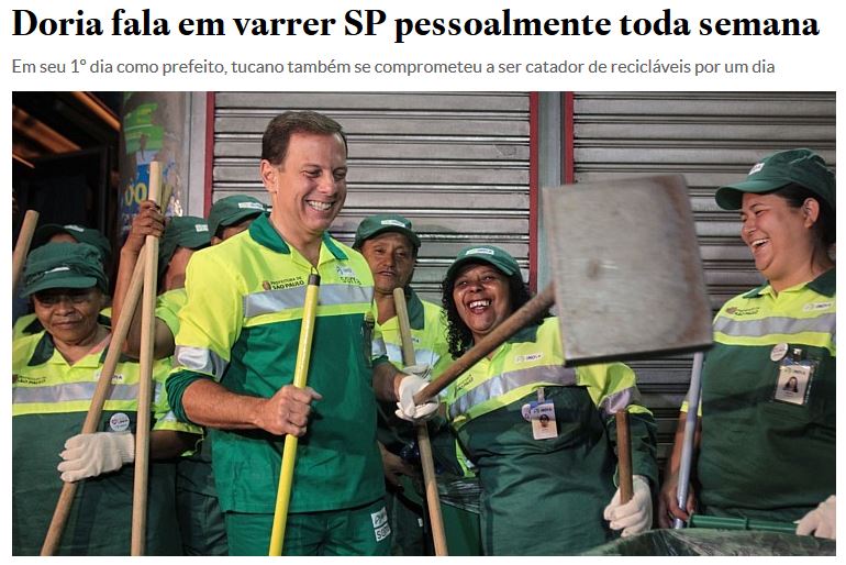 O prefeito Doria, que acaba de assumir a alcaidia da maior cidade do país, deu seu showzinho midiático logo no pimeiro dia de função: vestiu-se de limpador de rua, armou-se de pá e vassoura, e juntou-se aos varredores. Fez isso às 6h da manhã. O marketing é rastaquera, mas ninguém há de atirar-lhe a pedra. A intenção foi mostrar constraste com relação ao prefeito anterior, que muitos diziam pouco afeito ao trabalho.