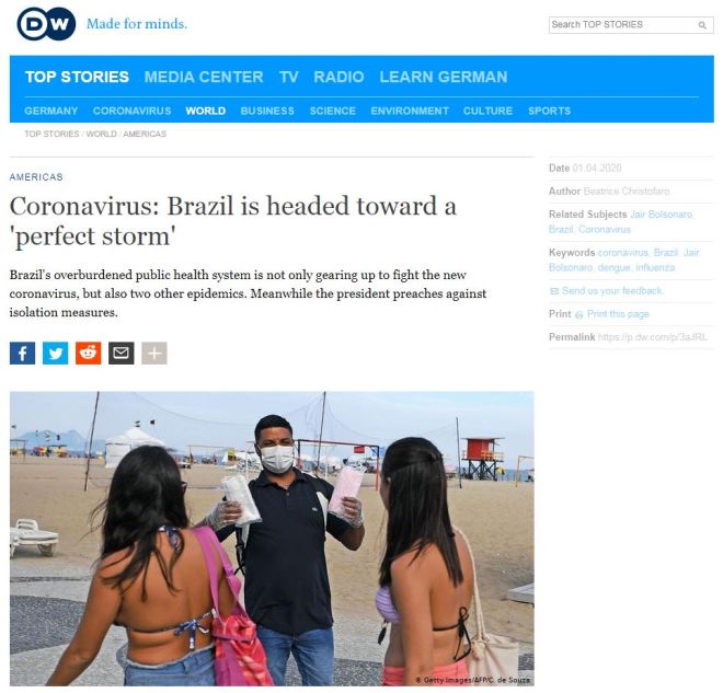 O mundo anda de olho grudado no Brasil. E não estão sonhando com o rumor das ondas de Ipanema nem com o rugido da onça-pintada na floresta tropical. Estão temerosos do desastre que começa a tomar forma com a chegada do coronavírus.
