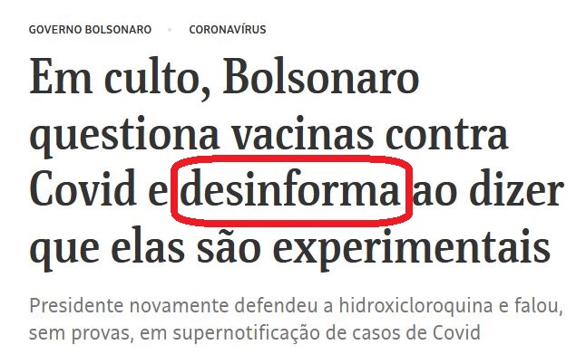 Segundo a chamada de jornal que reproduzo acima, “Bolsonaro desinforma ao dizer que as vacinas anticovid são experimentais”. Não concordo com a expressão. Não há por que recorrer a formulações suaves para traduzir o que disse o capitão. Praticar negacionismo explícito, quando uma tenebrosa pandemia está em curso, é ato grave. A meu ver, quem ajuda a abafar a realidade torna-se cúmplice do negacionismo presidencial.