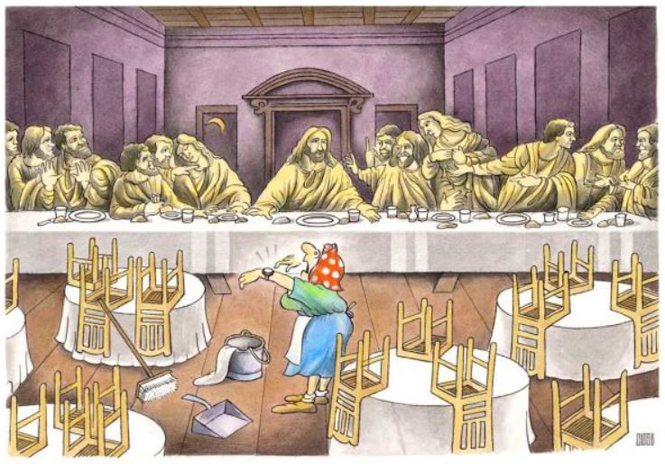 Um dos quadros do espetáculo evocou a Santa Ceia, superconhecida obra de Leonardo da Vinci. A apresentação, no entanto, não se fez num ambiente de piedade religiosa. Foi, antes, no gênero burlesco, em que personagens escapados de um quadro de Fernando Botero fizeram que a contrição fosse substituída pela comicidade.