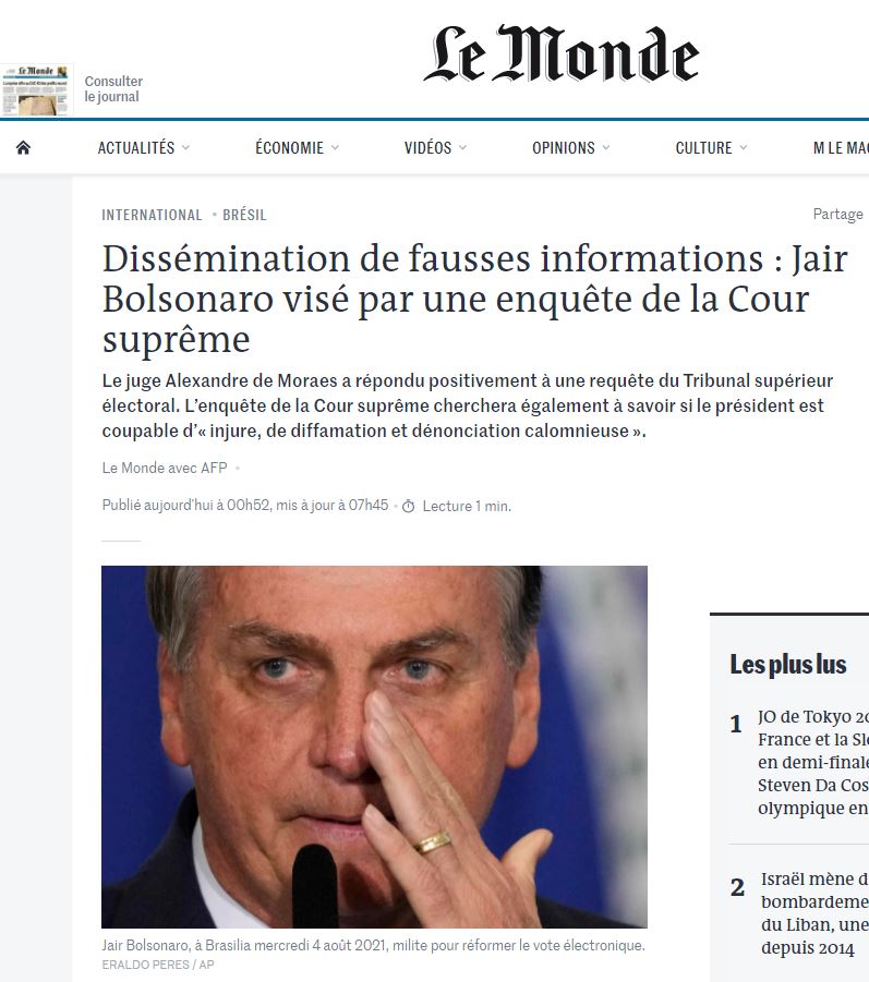 Não sei quais serão as consequências, no Brasil, do aparecimento de um protagonista de peso. Por aqui, o efeito foi imediato. E positivo. Logo de manhã, tanto a rádio suíça quanto a francesa abriram o jornal falado com a notícia do dia. Em meio ao relato de vitórias nos Jogos Olímpicos, todos aqui ficaram sabendo que “Monsieur Bolsonaro está sendo investigado pelos persistentes ataques ao sistema eleitoral de seu país”.