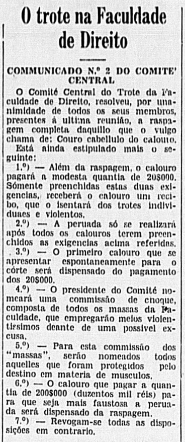 Numa demonstração de que não é de hoje que as classes abastadas gozam de privilégios inalcançáveis para os mais modestos, o comitê informa que, mediante pagamento de 200$000 (duzentos milréis, soma astronômica, correspondente ao preço de 1.000 jornais), o calouro será poupado e poderá conservar as melenas.